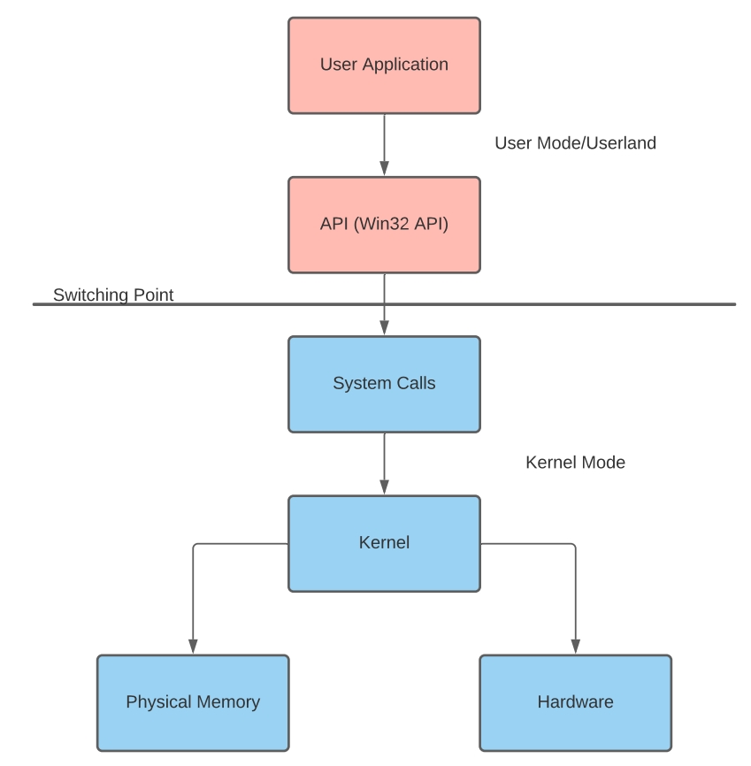 Windows distinguishes hardware access by two distinct modes: user and kernel mode. These modes determine the hardware, kernel, and memory access an application or driver is permitted. API or system calls interface between each mode, sending information to the system to be processed in kernel mode.